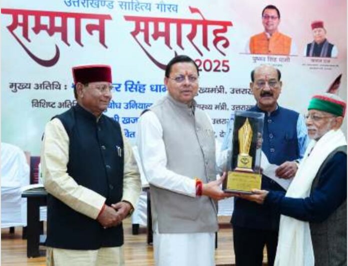 देहरादून, मुख्यमंत्री पुष्कर सिंह धामी ने उत्तराखंड के सर्वोच्च साहित्यिक सम्मान “उत्तराखंड साहित्य भूषण सम्मान” से डॉ. जितेन ठाकुर को सम्मानित किया। मुख्य सेवक सदन, मुख्यमंत्री आवास में उत्तराखंड भाषा संस्थान द्वारा आयोजित उत्तराखंड साहित्य गौरव सम्मान समारोह-2025 में इसके साथ मुख्यमंत्री ने डॉ. बुद्धिनाथ मिश्र, श्याम सिंह कुटौला, डॉ. प्रीतम सिंह, केसर सिंह राय एवं अताए साबिर अफजल मंगलौरी को उत्तराखंड दीर्घकालीन उत्कृष्ट साहित्य सृजन पुरस्कार से सम्मानित किया गया।