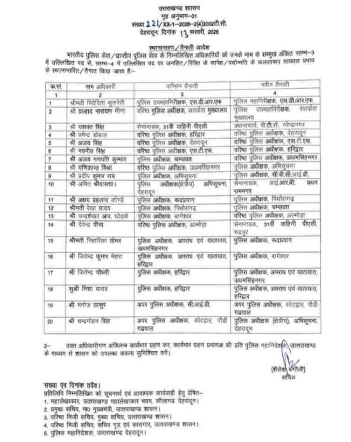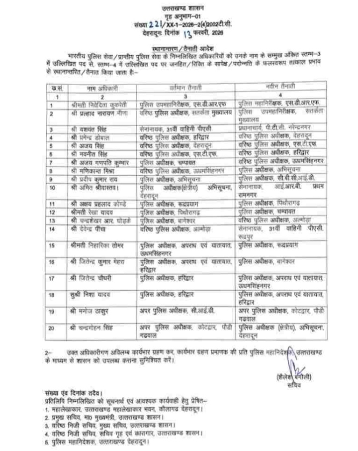 जबकि एसएसपी उधमसिंहनगर के एसएसपी मणिकांत मिश्रा को पुलिस अधिक्षक अभिसूचना जबकि पुलिस अधीक्षक चंपावत अजय गणपति को एसएसपी उधमसिंहनगर तैनात किया गया है।
