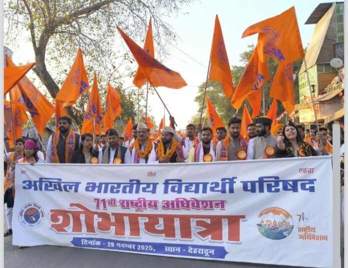 देहरादून, अखिल भारतीय विद्यार्थी परिषद (अभाविप) का 71वां राष्ट्रीय अधिवेशन उत्तराखण्ड के परेड ग्राउंड स्थित ‘भगवान बिरसा मुंडा नगर’ में 28 से 30 नवंबर तक आयोजित हो रहा है। इस अधिवेशन के दूसरे दिन 4.5 किलोमीटर लंबी शोभायात्रा पारंपरिक एवं सांस्कृतिक विविधता के साथ शहर की सड़कों पर निकाली गई, जिसमें देश के विभिन्न राज्यों से आए 1500 से अधिक विद्यार्थियों ने लघु भारत का सुंदर दर्शन कराया।शोभायात्रा के दौरान देहरादून की सड़कों पर “भारत माता की जय” तथा “कश्मीर से कन्याकुमारी भारत माता एक हमारी” के जयघोष गूंजे।