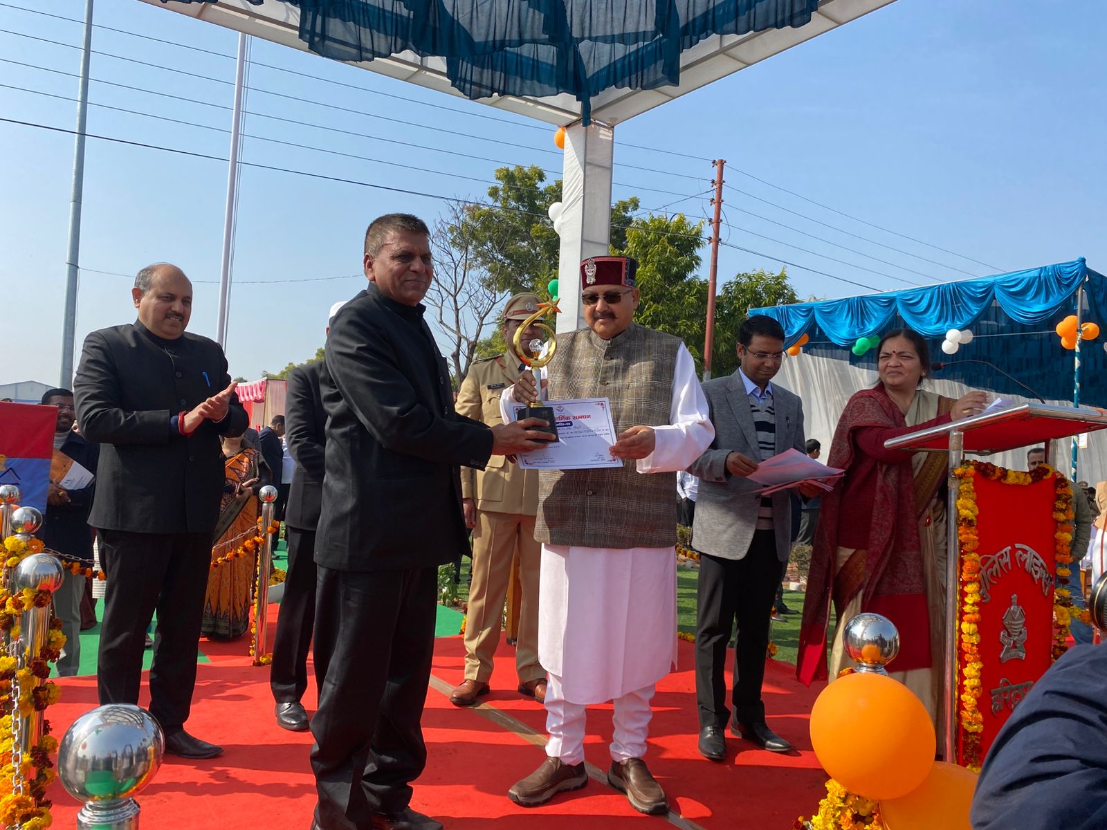 जनपद हरिद्वार के रोशनाबाद स्थित पुलिस लाईन परेड़ मैदान में गणतंत्र दिवस 2026 के पावन अवसर पर आयोजित भव्य परेड़ में मुख्य अतिथि उत्तराखंड सरकार के पर्यटन, सांस्कृतिक, सिंचाई एवं जनपद हरिद्वार के प्रभारी मंत्री सतपाल महाराज ने ऋषिकुल आयुर्वेद महाविद्यालय के शरीर रचना विभागाध्यक्ष/इंडियन रेडक्रास उत्तराखण्ड के चेयरमेन प्रो. डॉ. नरेश चौधरी को अपने मूल दात्यिवों के अतिरिक्त समर्पित उत्कृष्ठ सामाजिक कार्यों के लिए विशेष रूप से प्रमाण पत्र एवं प्रतीक चिन्ह देकर सम्मानित किया। डॉ. नरेश चौधरी को सम्मानित किये जाने पर प्रभारी मंत्री सतपाल महाराज ने कहा कि अपने- अपने मूल दायित्वों का निर्वहन सभी करते हैं परन्तु डॉ. नरेश चौधरी जैसे व्यक्ति समाज में अतिरिक्त सामाजिक सेवाओं एवं चुनौती पूर्ण कार्यों में अग्रणीय भूमिका से अलग उल्लेखनीय स्थान रखते हैं तथा उनको राष्ट्रीय पर्व गणतंत्र दिवस पर मिले सम्मान से अन्य सामाजिक स्वयंसेवकों को भी समर्पित सामाजिक कार्य करने की प्रेरणा मिलेगी। जिलाधिकारी मयूर दीक्षित, वरिष्ठ पुलिस अधीक्षक प्रमेन्द्र डोबाल, मुख्य विकास अधिकारी डॉ. ललित नारायण मिश्रा, पुलिस अधीक्षक जितेन्द्र मेहरा, जितेन्द्र चौधरी, पुलिस अधीक्षक देहात शेखर सुयाल, पुलिस अधीक्षक नगर अभय प्रताप सिंह, मुख्य चिकित्सा अधिकारी डॉ. राजेश सिंह, सीओ विवेक सिंह, नरेन्द्र पंत, अभिनय चौधरी, संजय चौहान, विपेन्द्र सिंह, श्रीमती जूही मनराल, नताशा, पुलिस अधीक्षक संचार विपिन कुमार, जिला विकास अधिकारी वेदप्रकाश ने डॉ. नरेश चौधरी को सम्मानित किये जाने पर विशेष रूप से बधाई दी।