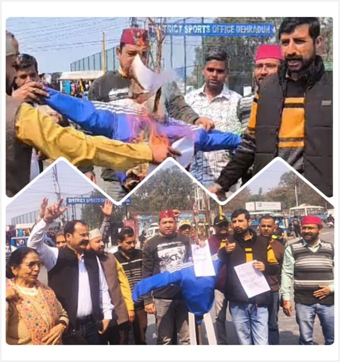 देहरादून, प्रारंभिक शिक्षा निदेशक अजय नौडियाल के साथ हुई मारपीट का मामला थमने का नाम नहीं ले रहा है ।लैंसडौन चौक में विभिन्न संगठनों के पदाधिकारियों ने सामाजिक कार्यकर्ता अनिल डोभाल के नेतृत्व में एकत्रित होकर रायपुर विधायक उमेश शर्मा ‘काऊ’ का पुतला दहन कर जल्द ही गिरफ्तारी मांग की ।